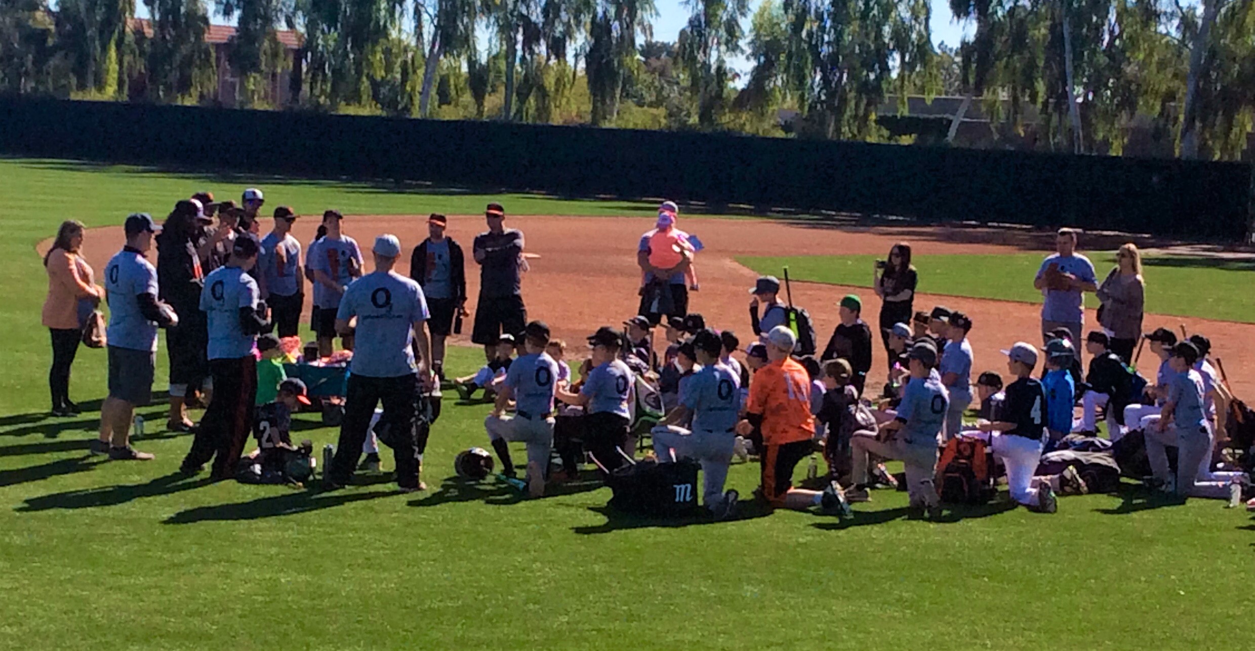 On the first day of baseball camp, we woke up early, had breakfast, and drove to Scottsdale. When we got to Scottsdale stadium, we signed in and went to the field, while the parents and family went to the observation deck (Mom, Dad, and Aunt Patti).