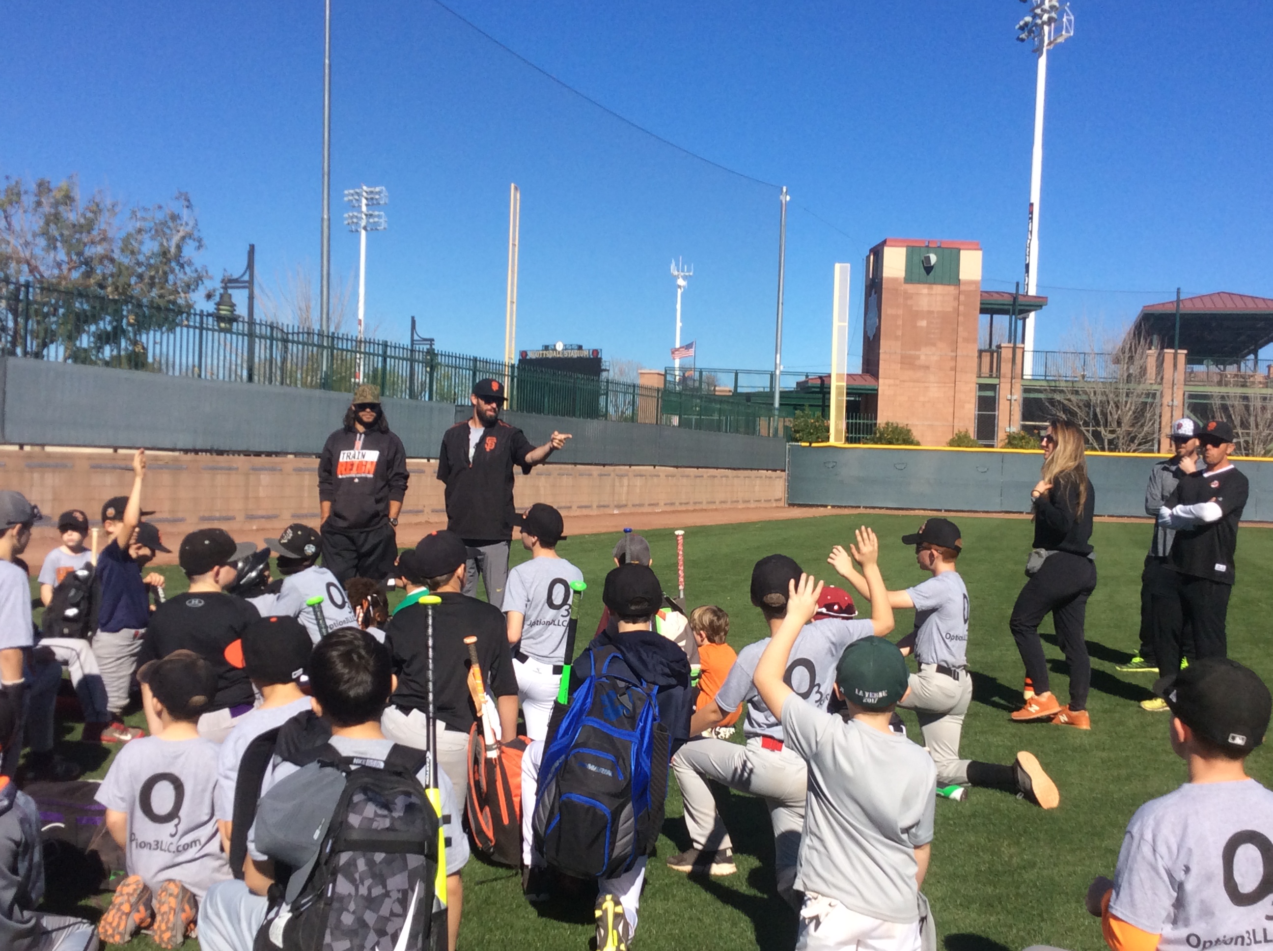 When we gathered on the field at the start of the day, we were very excited to see San Francisco Giants shortstop Brandon Crawford, as well as San Francisco Giants Coach Chad Chopp! Coach Chopp is the Giants left-handed batting practice pitcher and a video replay analyst. There were also many other coaches and assistants.